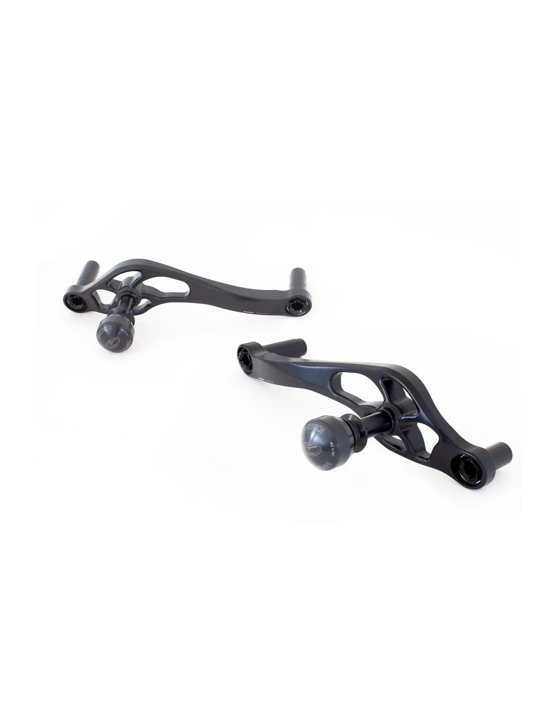 Los protectores que se anclan a la moto o a dicha pletina constan de una base o taco realizado en aluminio aeronáutico mecanizado CNC con un amplio hueco interior y tornillería de acero 8.8 que cuenta con una rigidez controlada que evita el estrés en su punto donde va anclado a la moto.