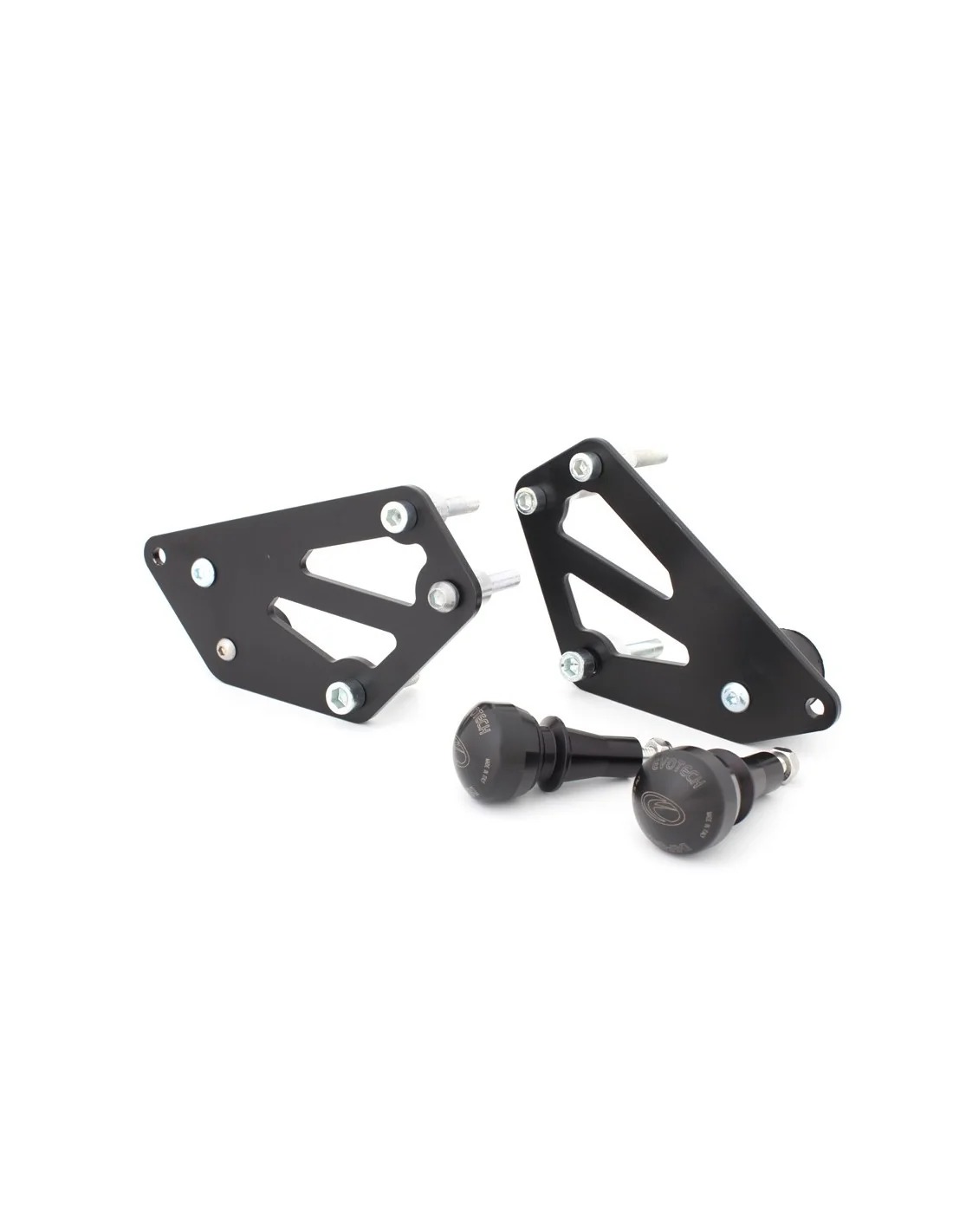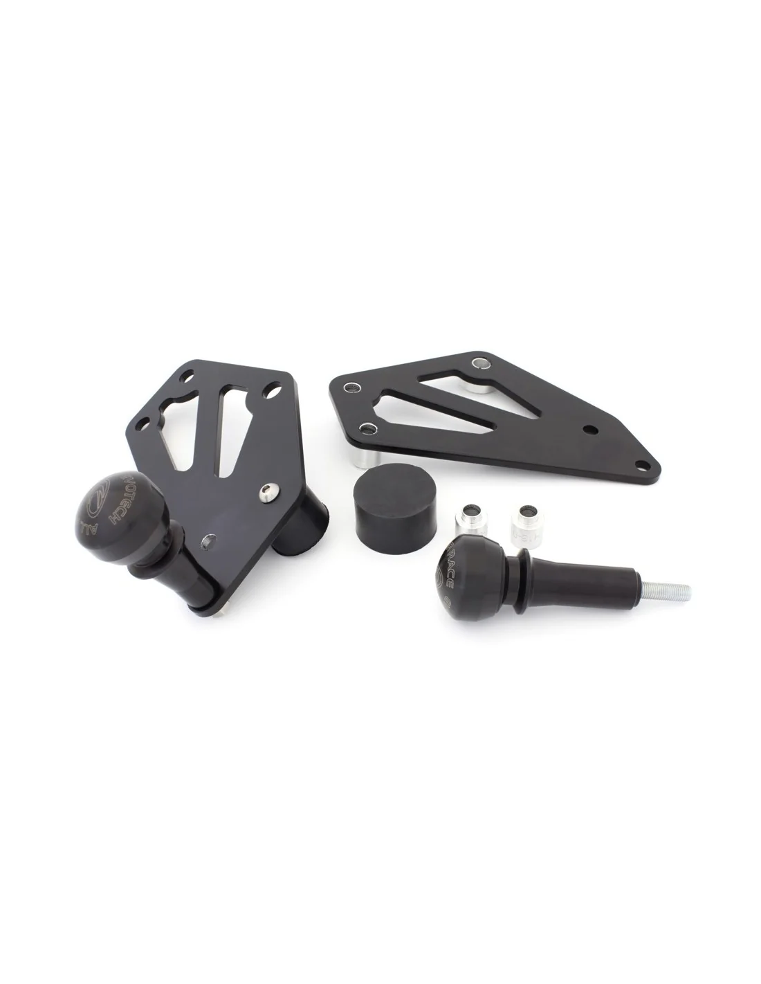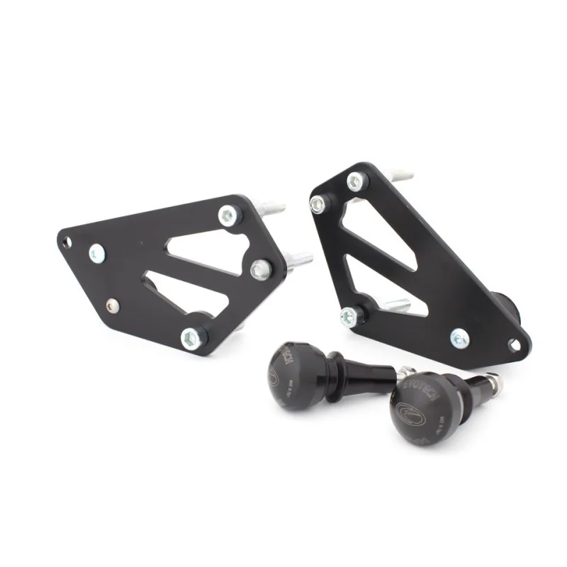 Los protectores que se anclan a la moto o a dicha pletina constan de una base o taco realizado en aluminio aeronáutico mecanizado CNC con un amplio hueco interior y tornillería de acero 8.8 que cuenta con una rigidez controlada que evita el estrés en su punto donde va anclado a la moto.